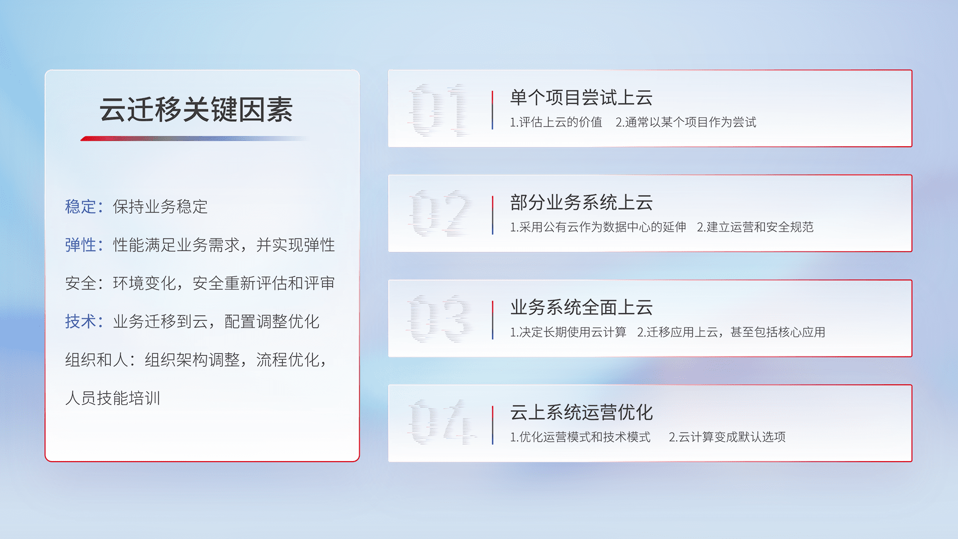 结合实际业务,,,,从规划设计、、、云平台选型、、云原生改造、、、、数据迁移、、、、集成交付,,,迁移全过程为客户识别最佳上云路径,,做好风险识别管理,,,设计网络架构、、、身份权限、、、、安全审计合规、、操作审计、、、、日志审计、、监控告警策略、、、多站点容灾设计等,,,对云上基础设施进行整体规划,,提升IT治理水平,,以满足弹性、、、、高可用、、高性能的需求。。。。